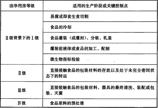 注:表中生產(chǎn)階段或關(guān)鍵控制點(diǎn)應(yīng)符合本規(guī)范表4.2.1的說明,具有高污染風(fēng)險(xiǎn),才適用Ⅱ級背景下的Ⅰ級(含設(shè)備自身具備的)的條件,如冷卻階段中的月餅、酸奶的冷卻,檢驗(yàn)階段中的一般理化檢測則不適用此種條件。